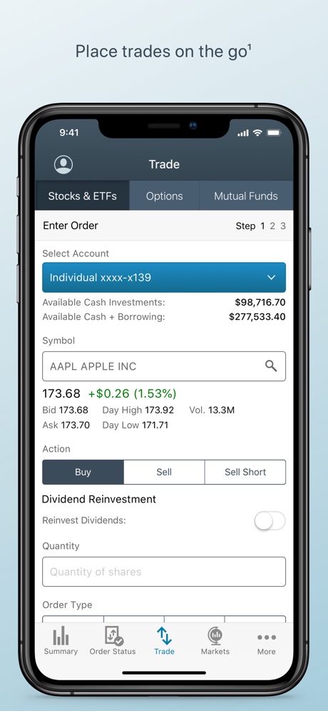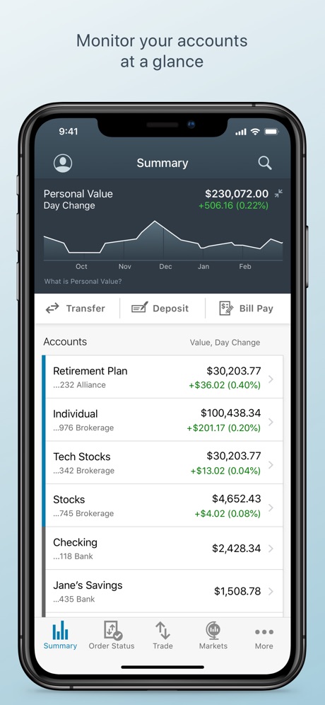 • Secure financial features, from wires to stock trading