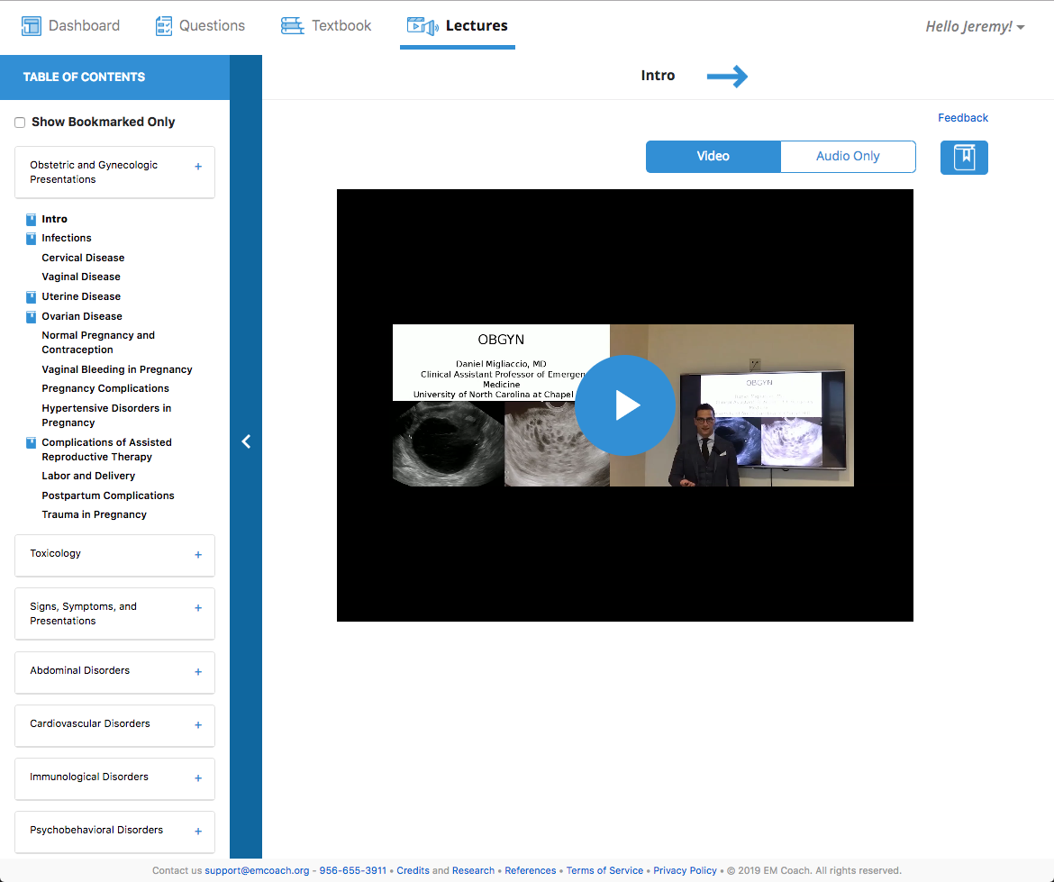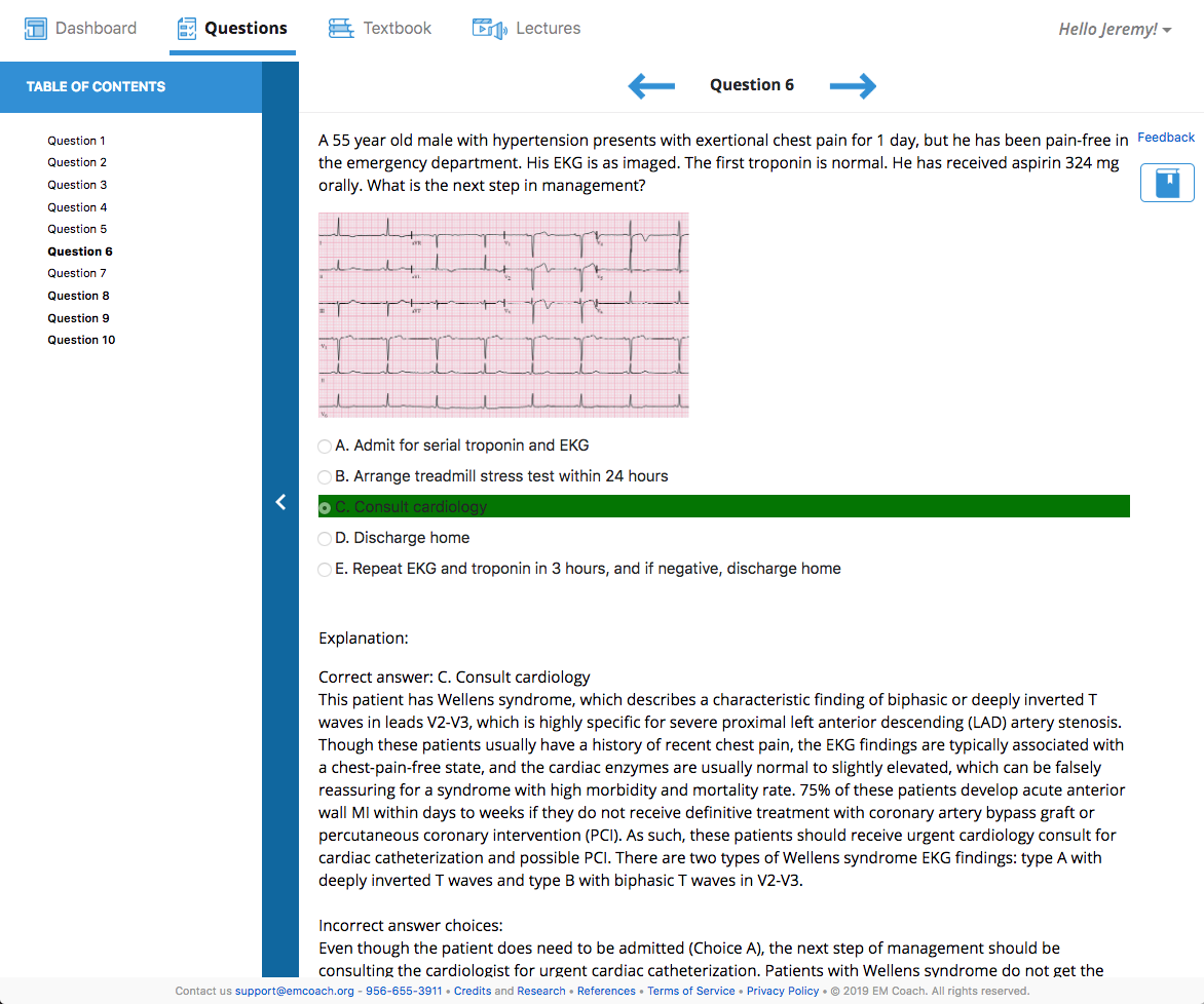 Built solo from the ground up, EM Coach delivers medical education content to US doctors and residents. Learners can choose to study either on their own, at the direction on an institutional instructor, or by following the coach, an automated assistant that assess the learner's needs and generate a unique 15 minute lesson based on the learner's needs, while also throwing in a bit of what they excel at to ensure retention of the learner's strengths. Education content is written and reviewed by board certified Emergency Medicine Physicians. Each piece of content is created in 3 forms: practice tests, textbook readings, and lectures. This provides differentiated instruction to the learner and empowers them to seamlessly switch between content types if they need additional clarification and support.