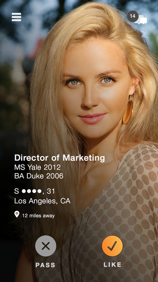 This app requires both Facebook and LinkedIn login for use. These logins not only pull in information about the user, but also verify that they went to an Ivy League school. Using your age and gender preferences, the app finds potential matches in your area. Once both users like each other, their profile information becomes visible and they enter a private chat.