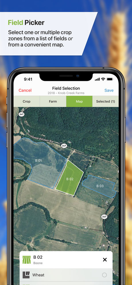 • Interface with crops via lists or by selecting map boundaries, complete with GPS tracking
